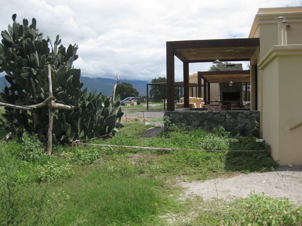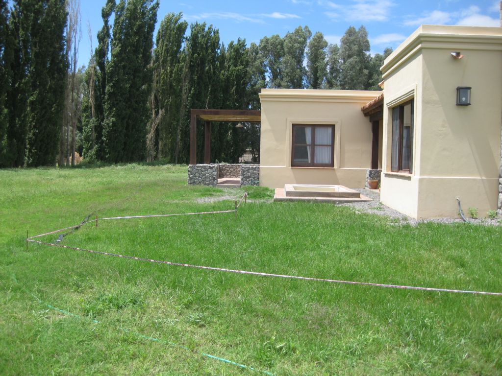 At approximately 5 meters from the entry, you will arrive to a parking lot (10 x 10 m) belonging to the guesthouse. It has the benefit of enlarging the parking area and avoiding too many cars from being next to the main house. In fact, a crowded parking place would ruin the view from the “parrilla”. The road, with a boundary of grasses and flowering plants, continues towards the main parking lot, which will have the shadow of three molle trees and a trellis for two cars.